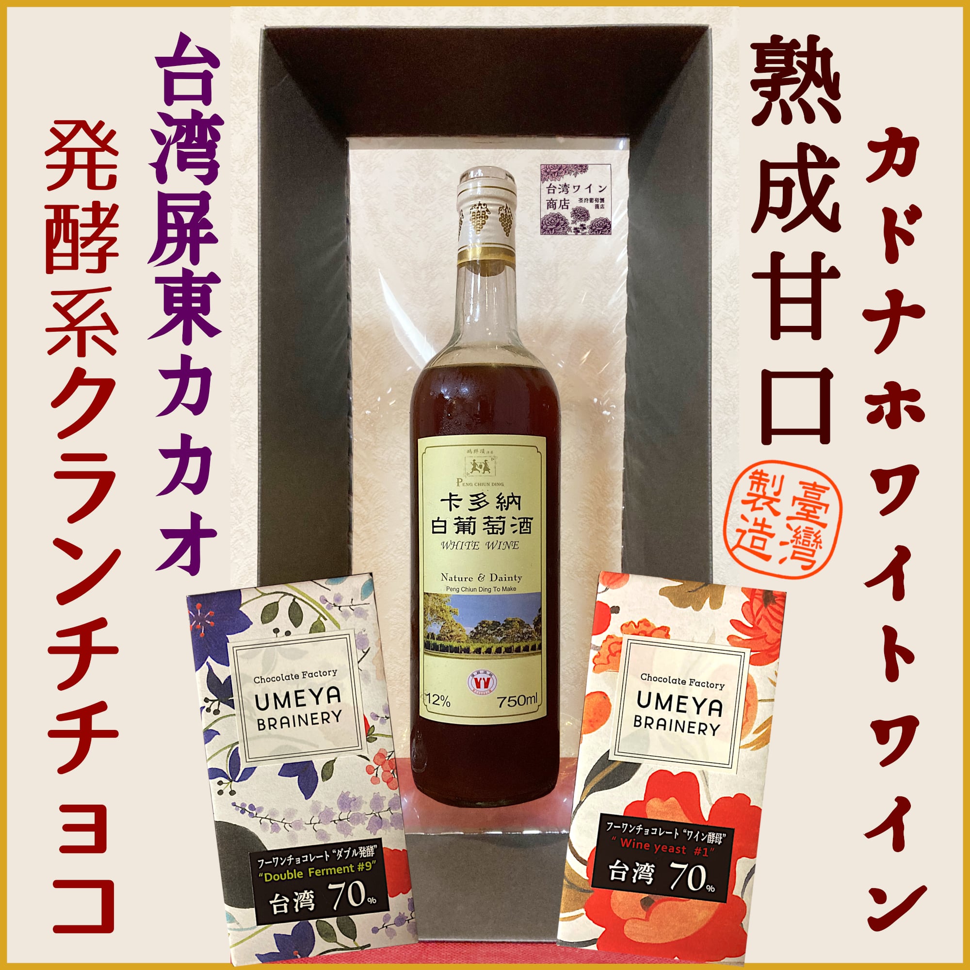 厳選した台湾産の発酵カカオから作る2種類のチョコレートと、独特の甘みを持つ特別で唯一無二な台湾ワイン